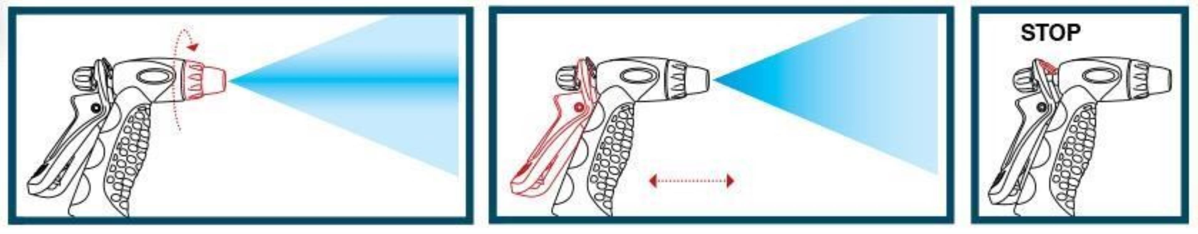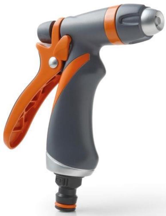 Spritzenkörper aus Metall mit Messingkomponenten, Handgriff mit Gummiüberzug, Wasserstrahlregulierung vom Sprühnebel bis zum geraden Strahl, Trigger kann arretiert werden, max. Wasserdurchfluss 10 l/min (4 bar), kompatibel mit Gardena System