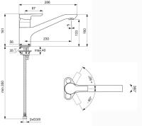 DN 15, mit 360° schwenkbarem Gussauslauf und Luftsprudler, Ausladung: 230 mm, Auslaufhöhe: 133 mm, Bedienungshebel aus Metall, Befestigung: von unten, flexible Anschlussschläuche G 3/8, erforderlicher Lochdurchmesser: 35 mm, Kartusche: mit keramischen Dichtscheiben, Kartuschenübersetzung aus...