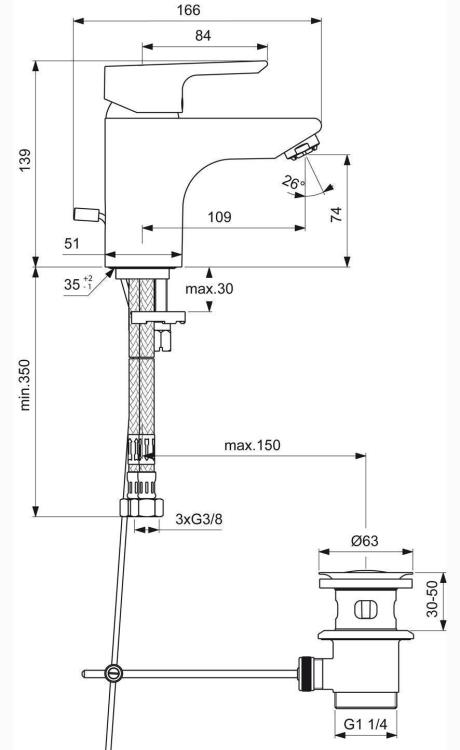 DN 15, mit starrem Gussauslauf und Luftsprudler, mit Zugknopf-Ablaufgarnitur 5/4", Ausladung: 109 mm, Auslaufhöhe: 74 mm, Bedienungshebel aus Metall, Schnellbefestigung: von unten (EASY FIX), flexible Anschlussschläuche G 3/8, Kartusche: mit keramischen Dichtscheiben, Kartuschenübersetzung aus...